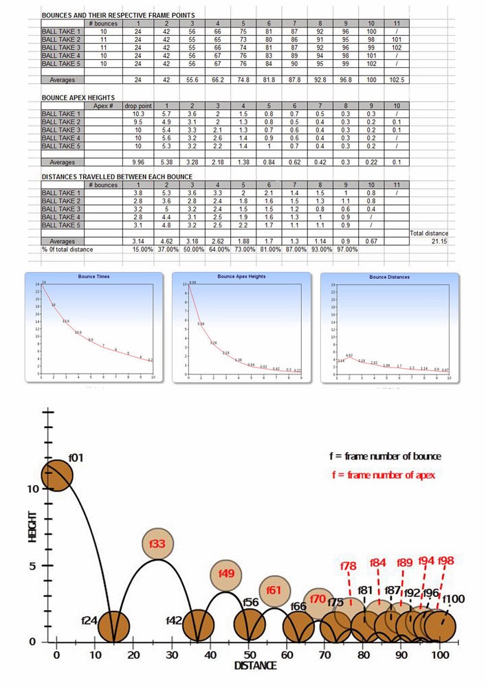 I went through some very tedious number crunching (number of bounces, frames between bounce and apex etc) and came up with the following graphs (marking apex heights per bounce):